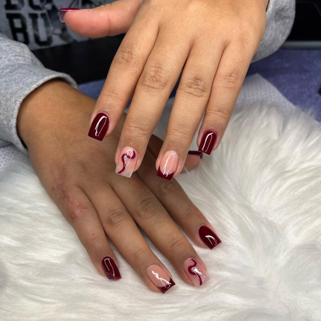 It combines deep burgundy French tips, solid burgundy nails, and abstract burgundy and white swirls for a modern, high shine finish.