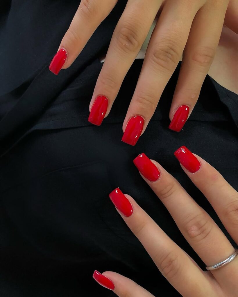 These short square nails in glossy cherry red rely purely on color and precision. Clean edges make all the difference.
