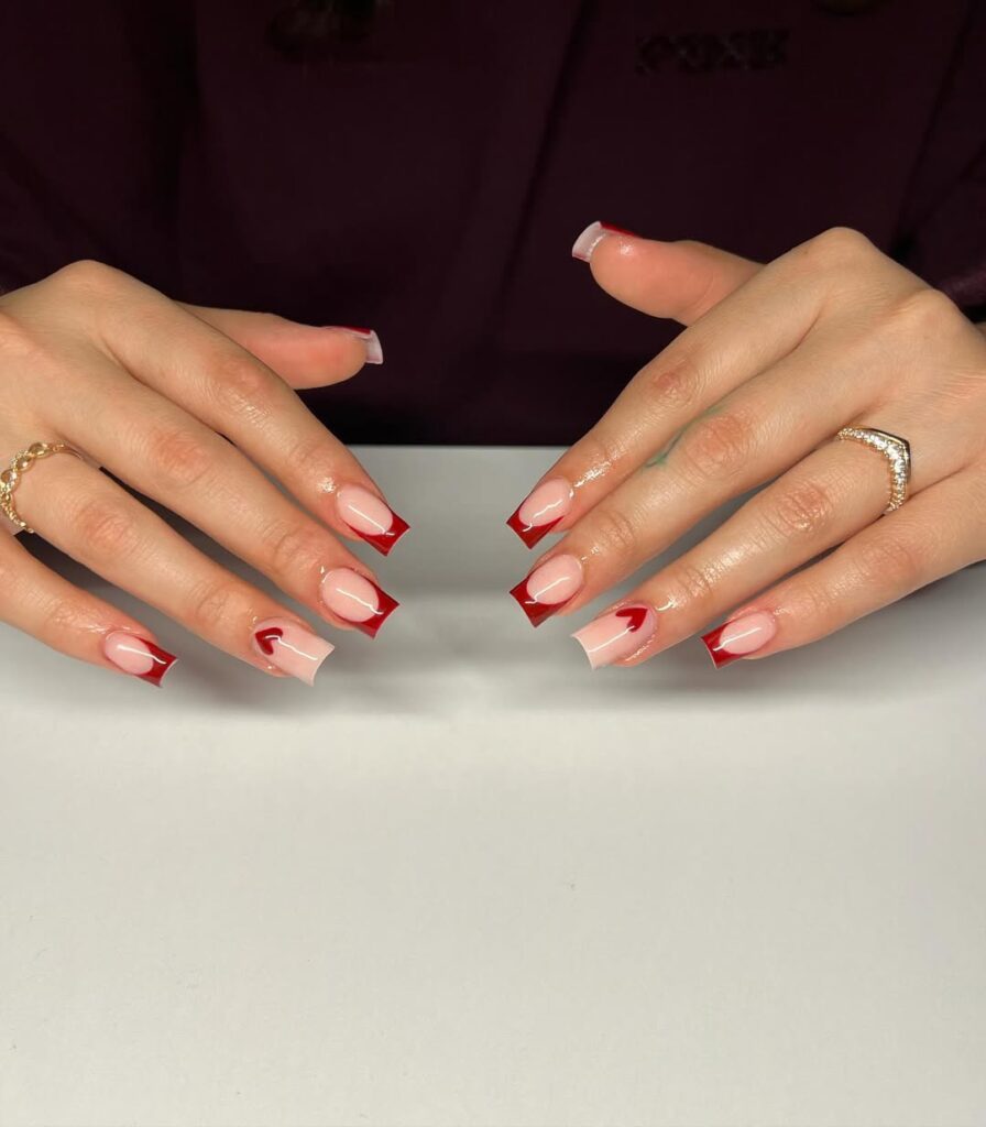 These glossy red French tips with a single tiny red heart on each ring finger create a clean, romantic look.