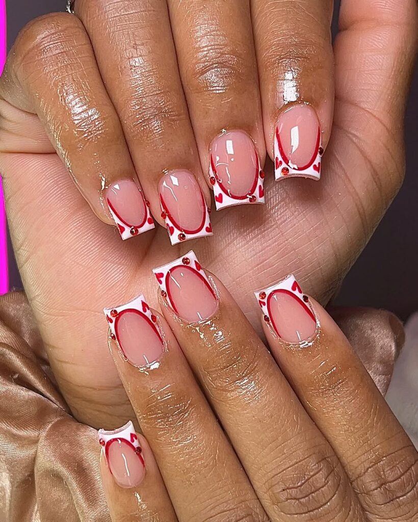 These white French tips with red heart outlines and rhinestones feel sweet but polished. The short square shape prevents it from looking childish.