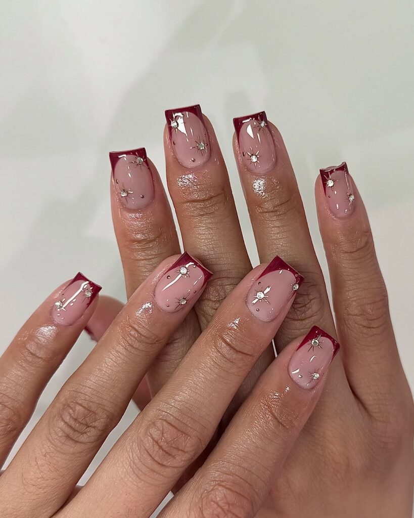 These deep burgundy French tips with sparkling starbursts and rhinestones create a subtle festive vibe. The glossy finish keeps everything sleek.