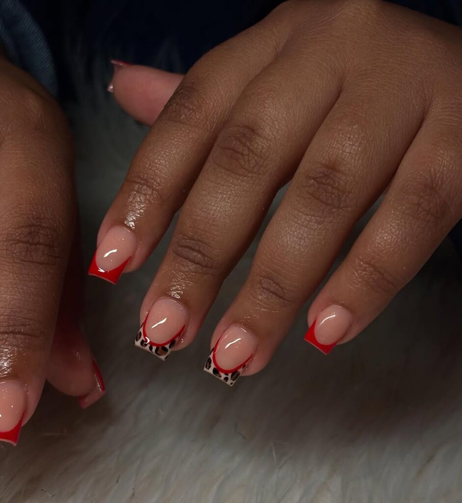 This version keeps bold red French tips and classic leopard accents without extra detailing. It looks modern, clean, and slightly fierce.