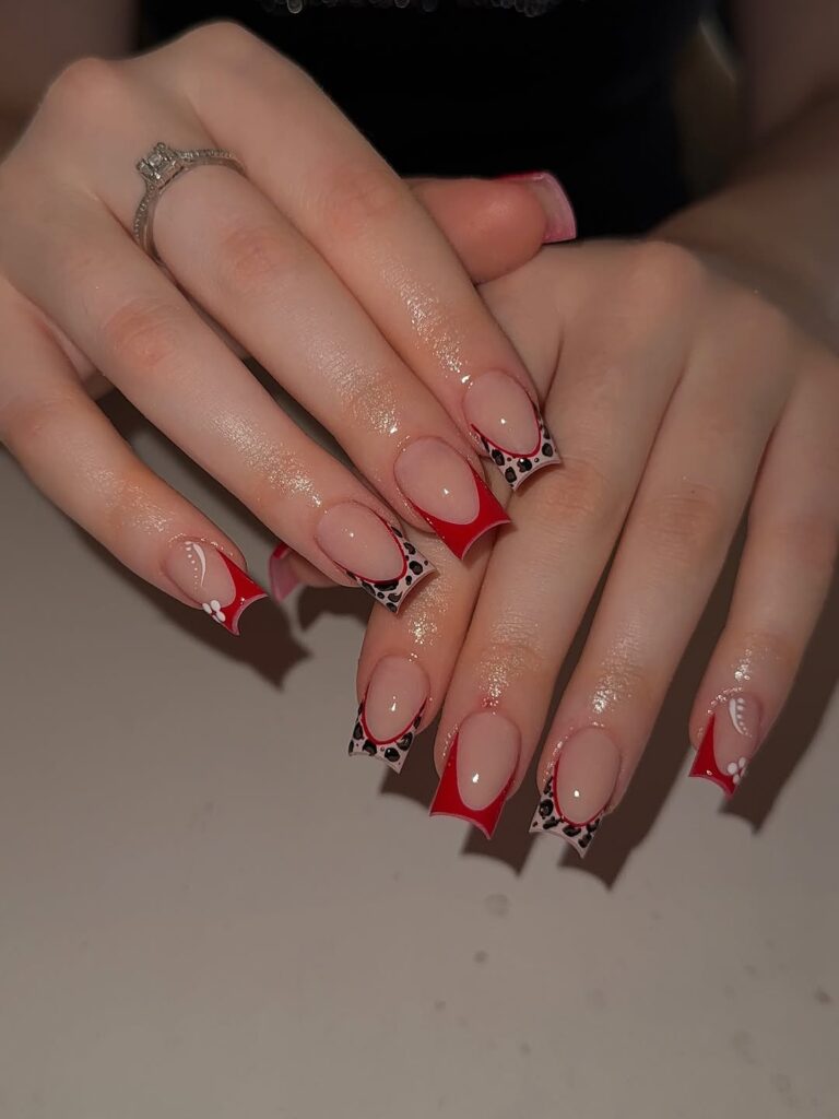 This design combines bold red French tips, black-and-white leopard print, and delicate white floral accents. It creates a high-contrast, trendy finish.