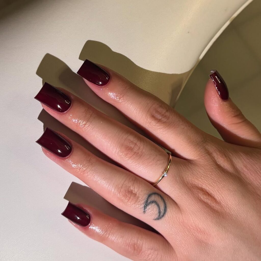 These glossy short square burgundy nails rely on solid color and shine alone. No patterns. No rhinestones. Just bold polish.