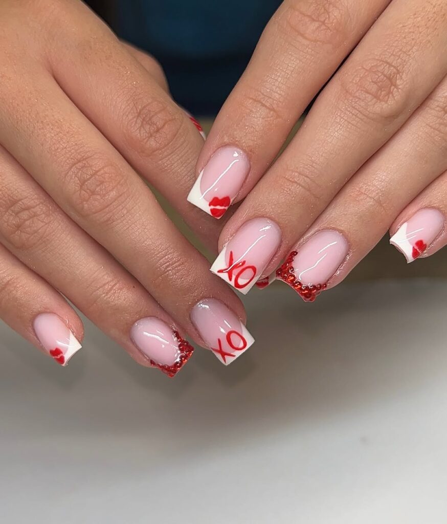 These short square nails with white French tips feature red “XO” lettering, lips, and glittering rhinestones. It feels playful but still clean.