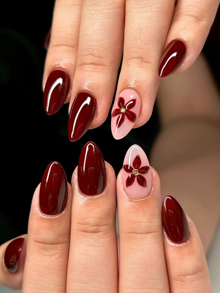 These short almond nails in glossy burgundy feature a delicate red flower with a gold center on a soft pink accent nail. The contrast feels soft yet powerful.