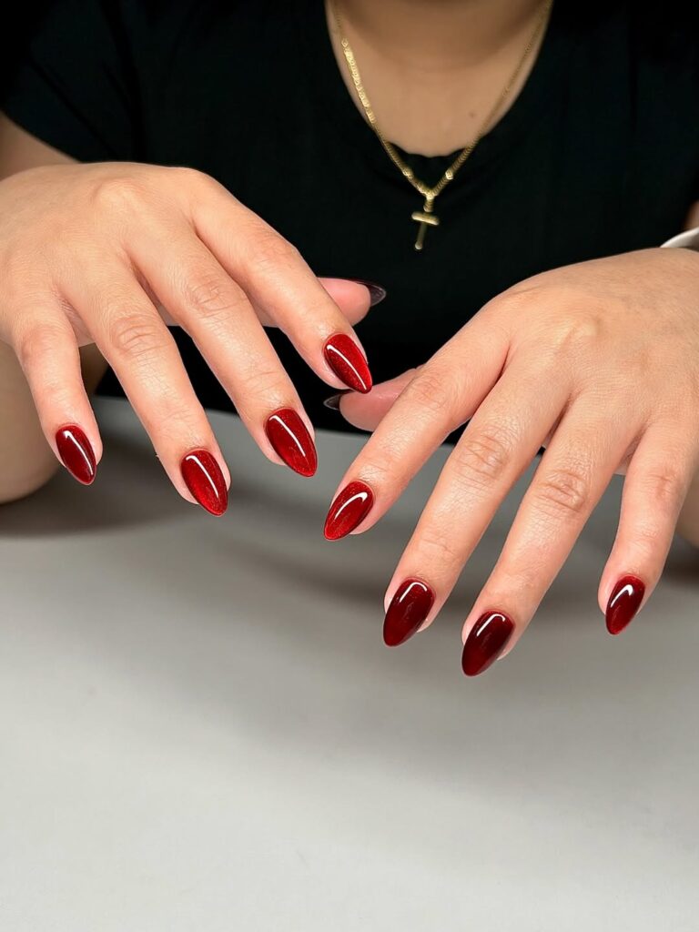 These short almond ruby red cat eye nails feature a shimmering, multidimensional finish that reflects light like velvet. The shine gives them depth without needing extra art.