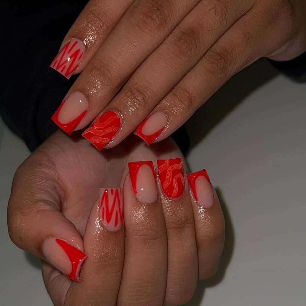 These short square red French tips mixed with abstract swirls and zigzags create a modern, artsy vibe. The clean base polish makes the red designs pop beautifully.