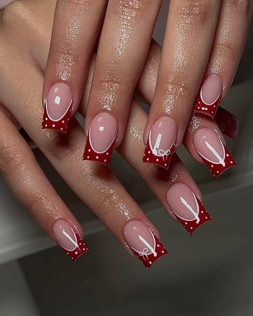 This design features deep red French tips on short square nails, topped with tiny white polka dots and delicate bow accents. The nude base keeps everything balanced and wearable.