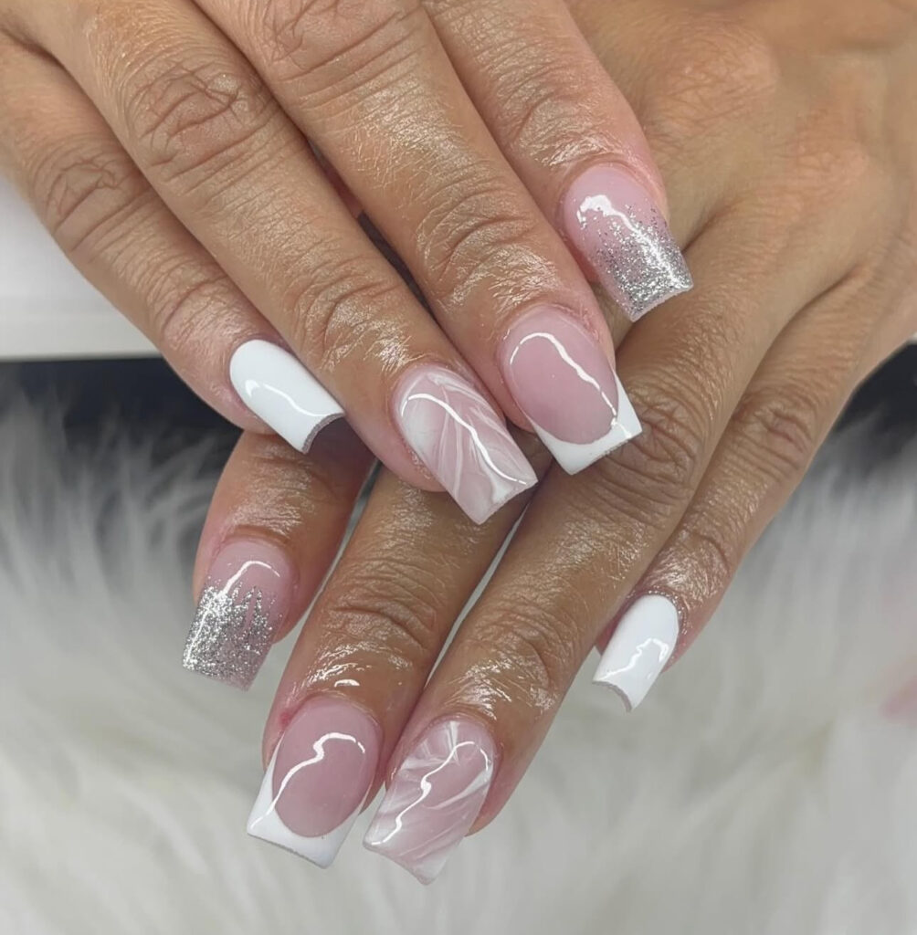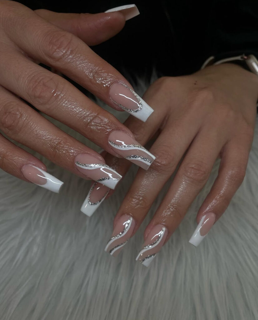 These long square nails feature white French tips with dynamic white and silver glitter swirls across a glossy nude base.
