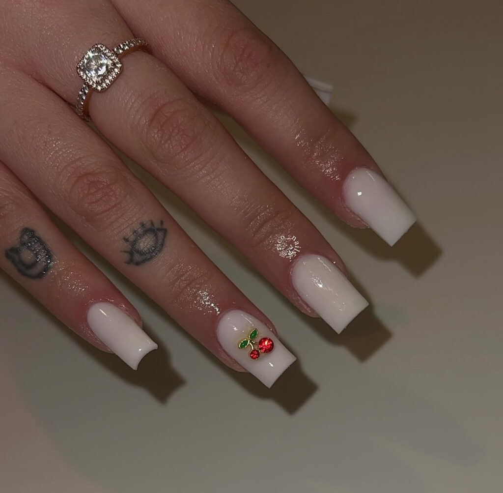 This design uses solid white nails with a 3D cherry charm featuring red crystals and green leaves. The bright charm creates a playful contrast against the clean base.