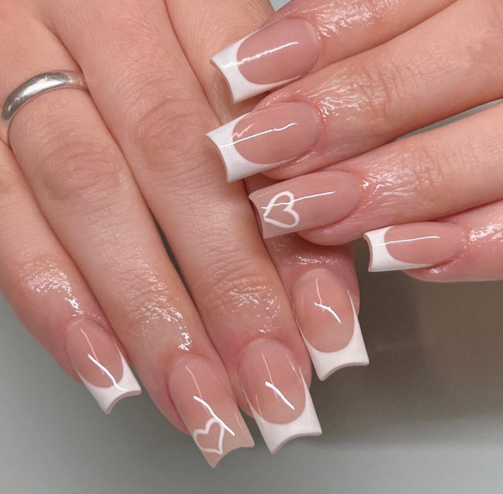 These long square nails feature classic white French tips with hand painted white heart outlines on accent nails.