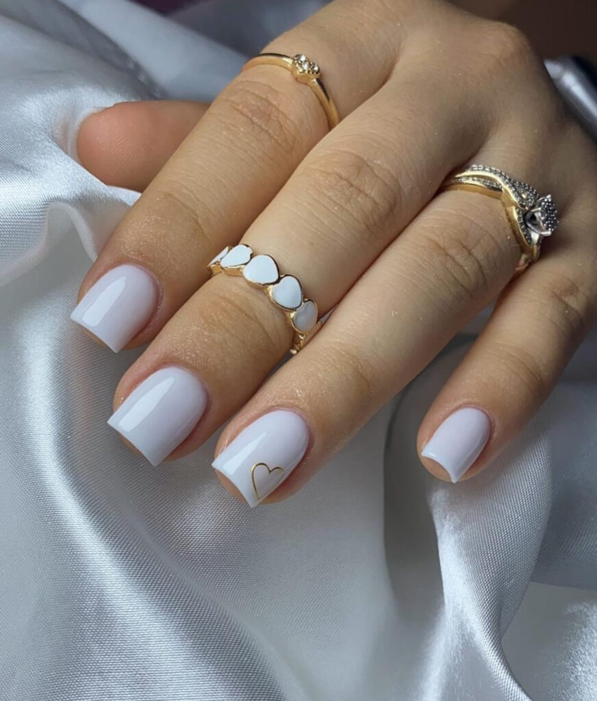 These short square nails use milky white polish with a single gold heart outline on the ring finger. That tiny accent adds personality without overwhelming the clean look.