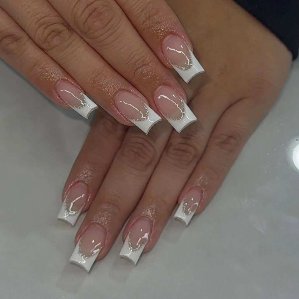 These nails feature white tips highlighted by a thin silver glitter outline. The glossy nude base keeps the design crisp and polished.