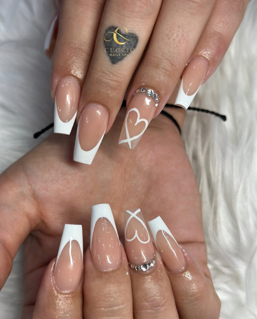These long coffin nails combine classic French tips with delicate white heart outlines. Rhinestones near the cuticle add subtle sparkle.
