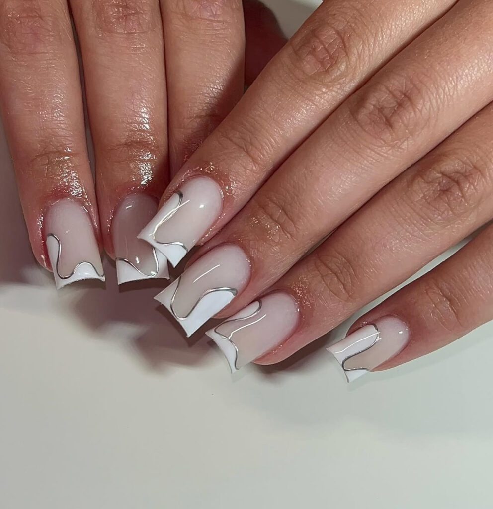 These nails feature milky white irregular French tips outlined by silver chrome swirls. The metallic detail adds a futuristic vibe without overpowering the design.