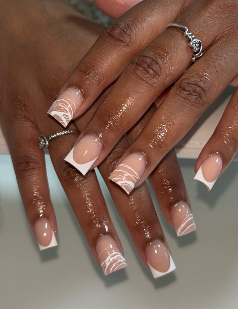 These long square nails alternate between French tips and delicate white spider web swirls. The glossy nude base keeps everything clean and sophisticated.