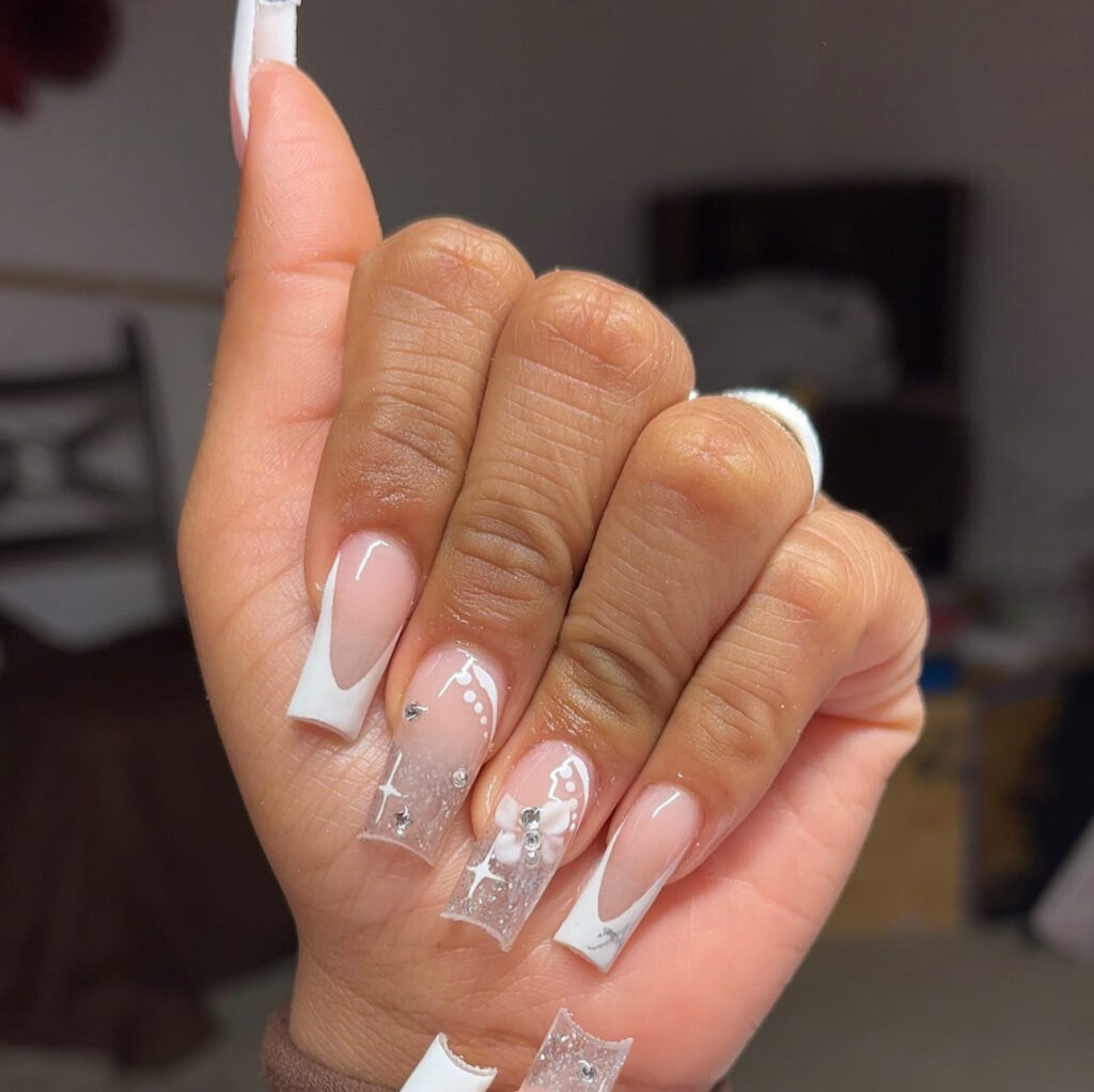 These nails feature white French tips blended with clear glitter ombre, plus decorative elements like: