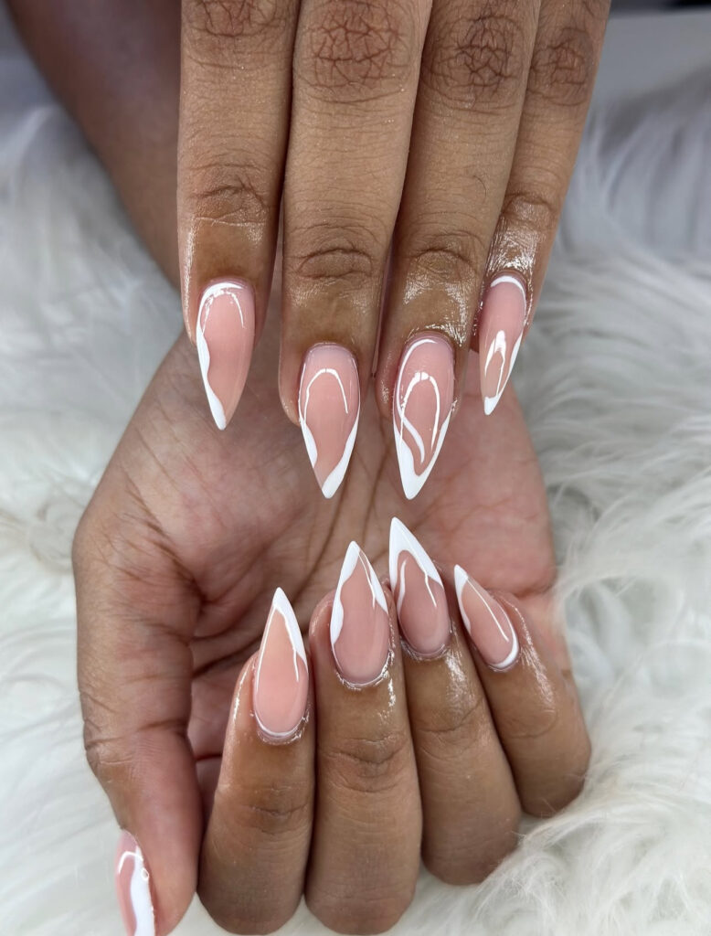 These sharp stiletto nails feature glossy nude bases with abstract white swirls flowing around the edges. The lines feel organic and artistic.