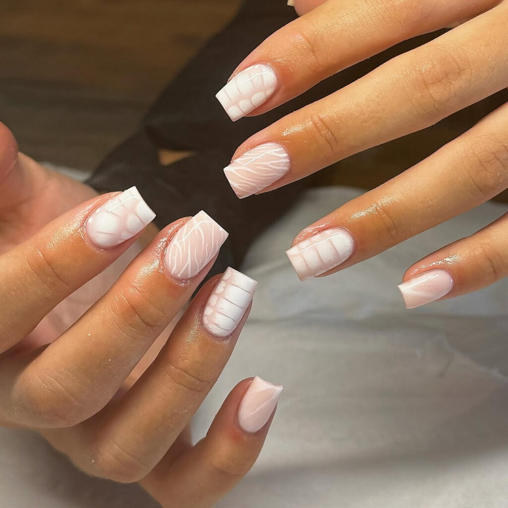 This design uses milky white polish with alternating 3D crocodile patterns and subtle marble swirls. The result feels sophisticated and fashion forward.