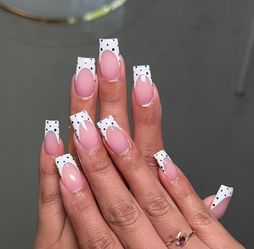 These long square nails combine a soft nude base with crisp white French tips, then add small black polka dots for personality. The look feels playful without becoming overwhelming.