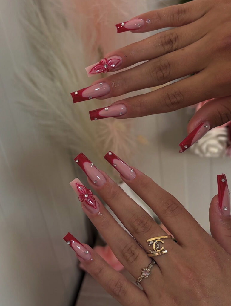 Deep red French tips with silver rhinestones and soft 3D florals look refined.
