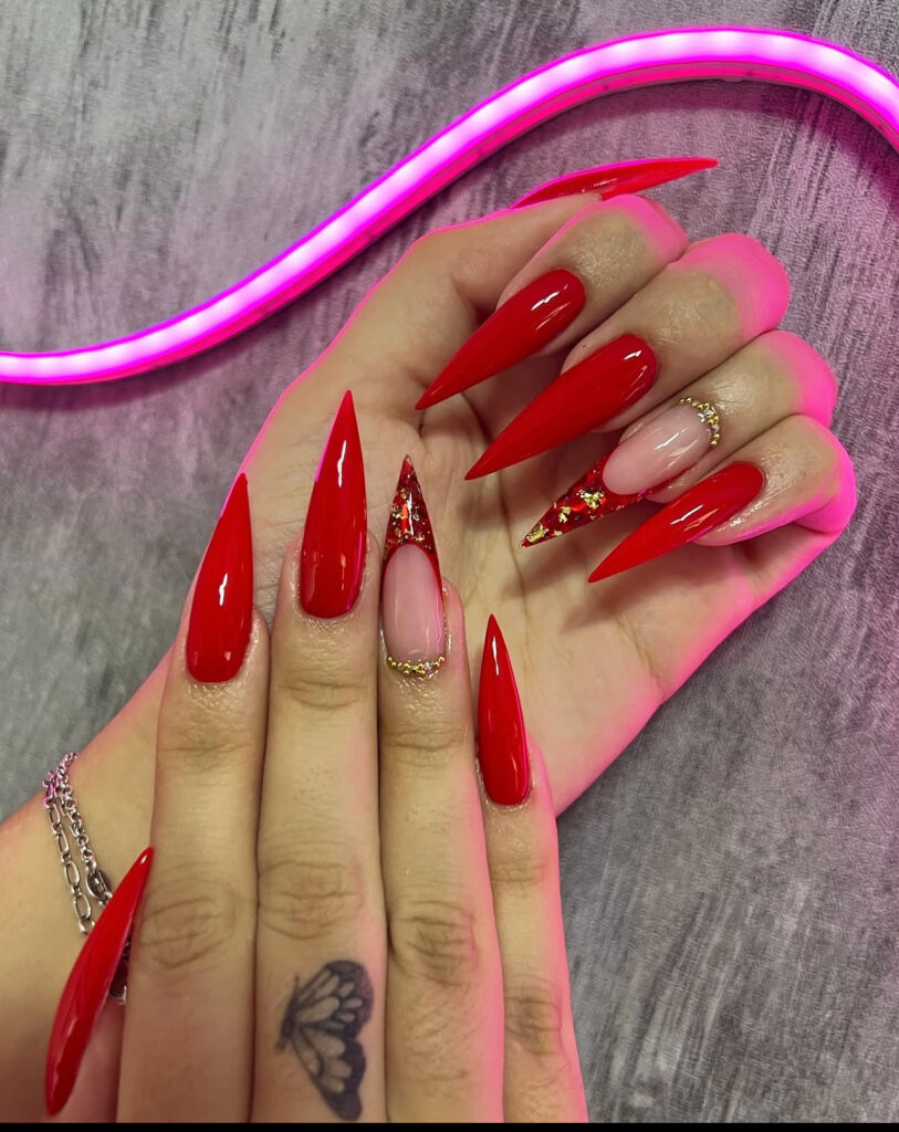 Deep red stiletto French tips with gold leaf and gold rhinestones feel regal.