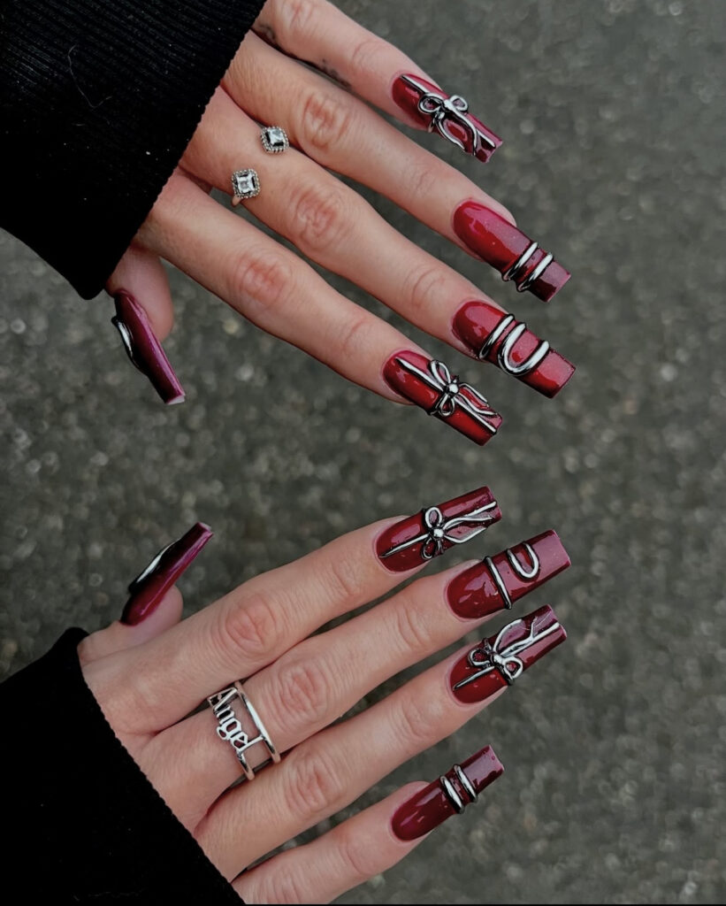 Deep burgundy square nails with bold 3D silver metallic ribbons and chrome bands feel edgy and modern.