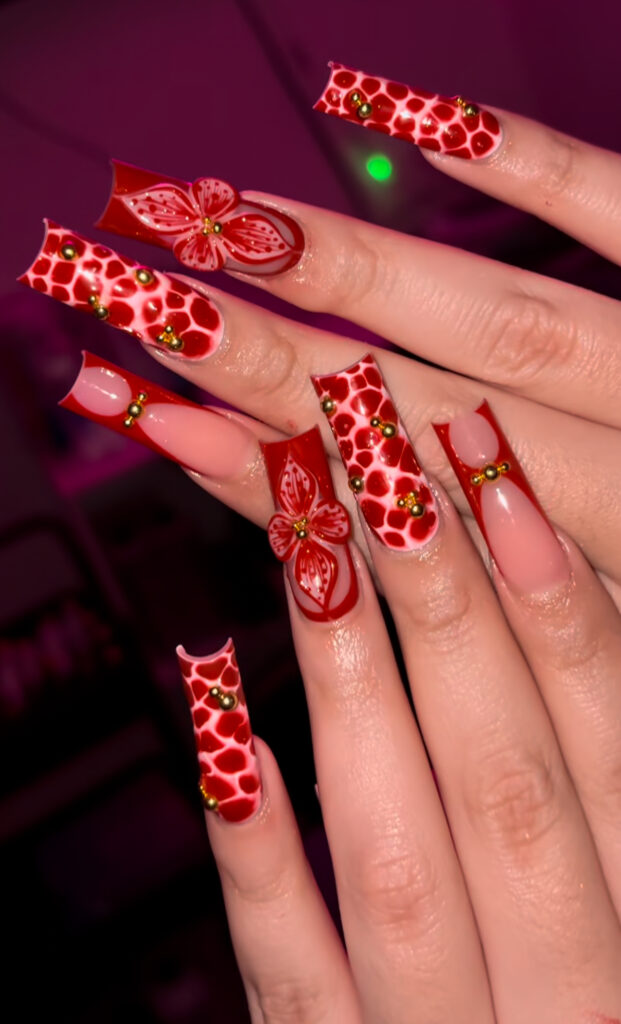 Red French tips mixed with 3D florals, red-on-white honeycomb patterns, and gold beads create artistic luxury.