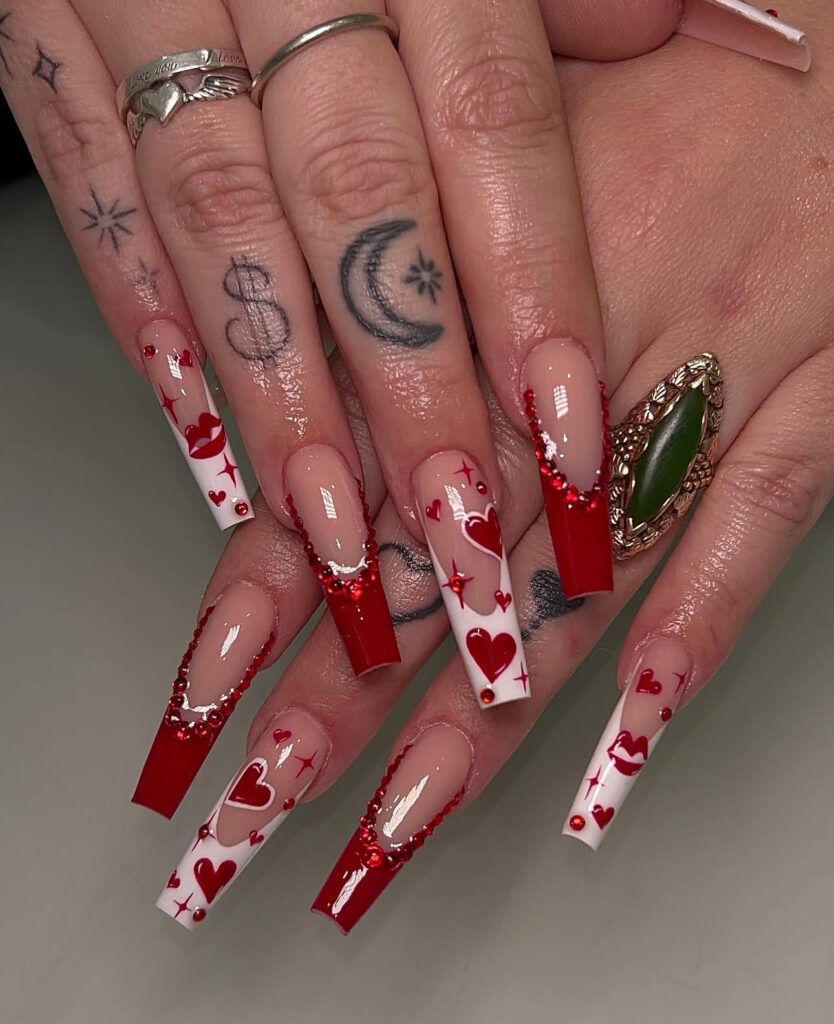 Glossy red French tips mixed with white accent nails, red hearts, lip prints, and rhinestones feel playful yet classy.