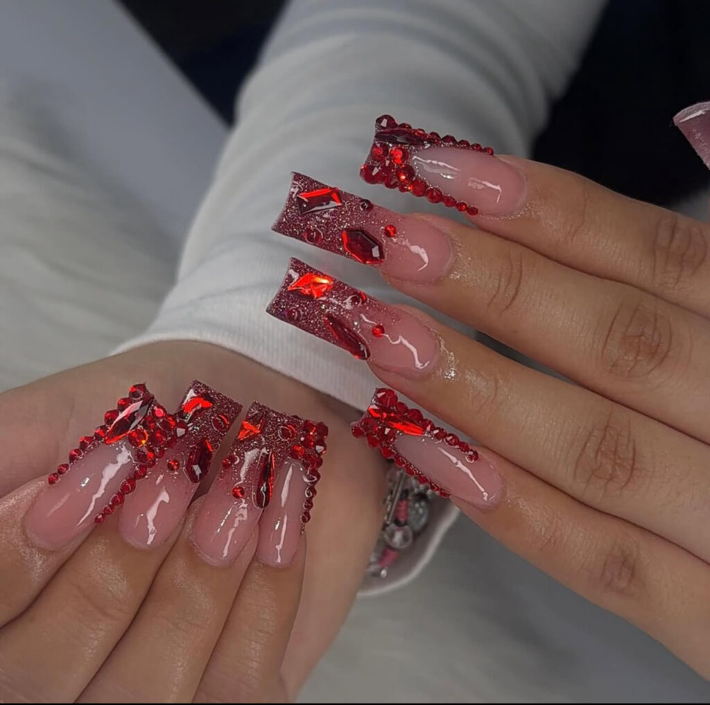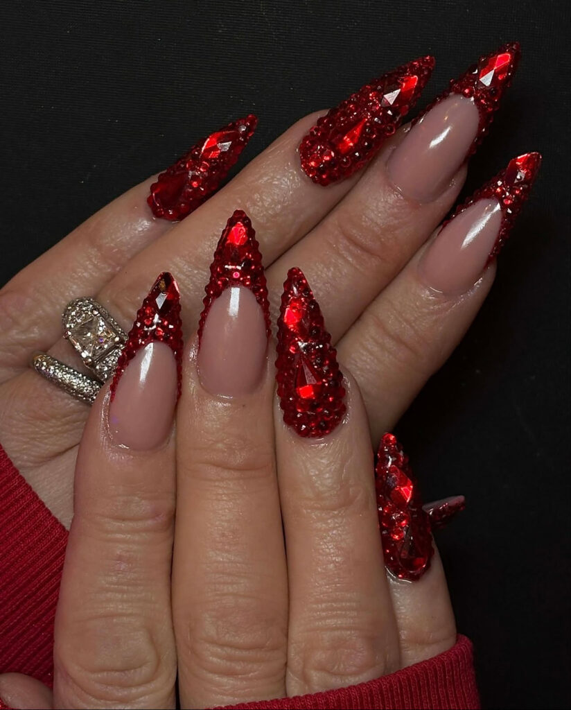 Glittery red ombré tips paired with large red gemstones? That’s maximum sparkle.