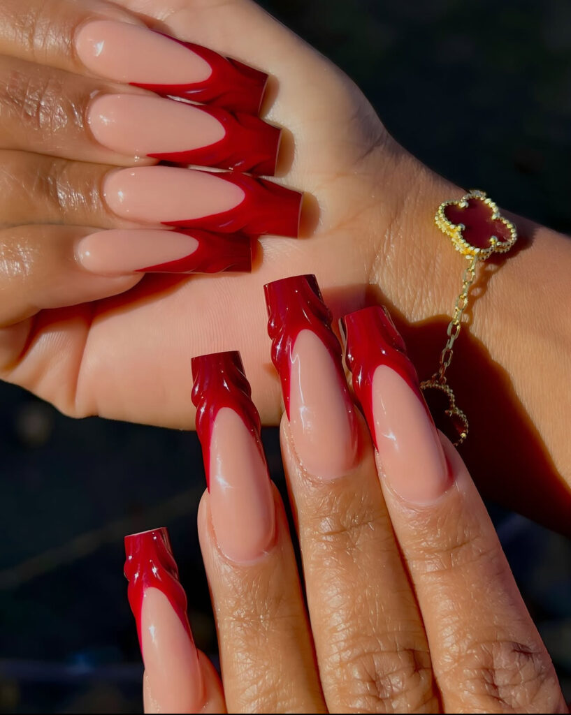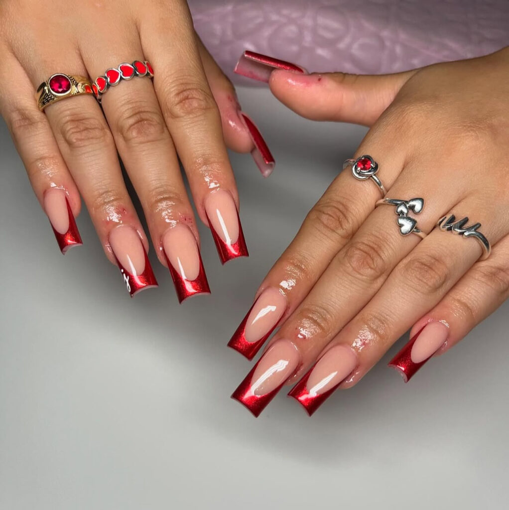 Metallic red French tips on square nude nails look rich and futuristic.