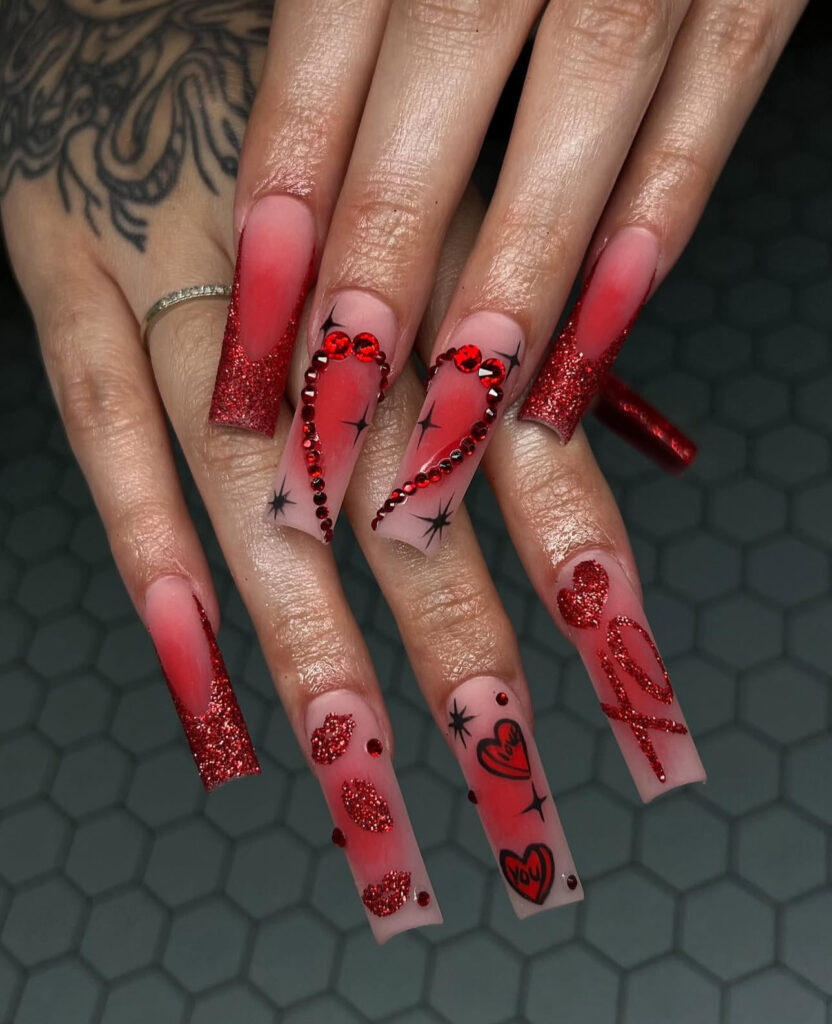 Matte nude base, red glitter French tips, rhinestone hearts, lip accents, and bold “XO” lettering? Fun, flirty, and confident.