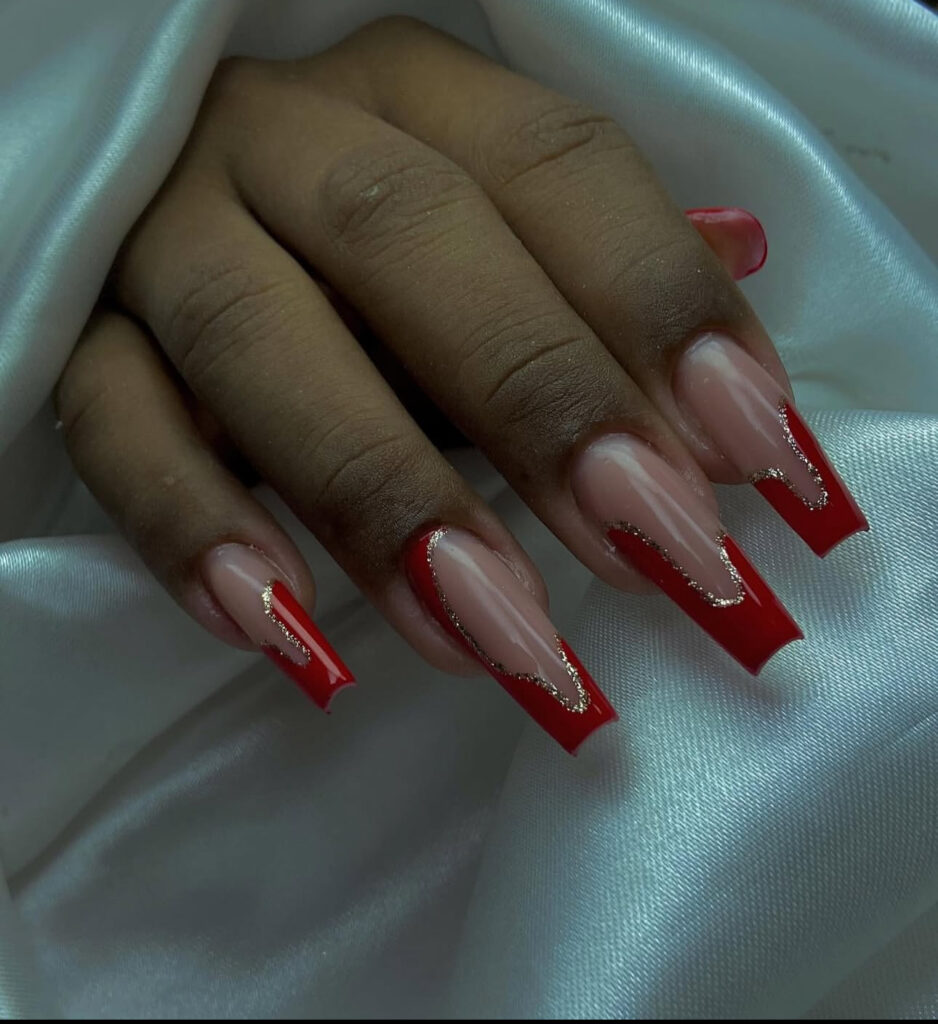 Square nails with bold red wavy tips and a thin gold glitter outline feel modern and artistic.