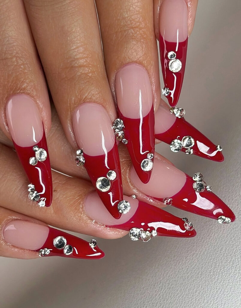Stiletto nails with glossy nude base, deep red French tips, and shimmering silver rhinestones create high-impact glamour.