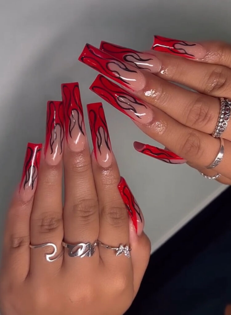 The black outline around the flames creates sharp contrast. That detail transforms the look from cute to seriously edgy. I love how the nude base keeps everything balanced while the red flames do all the talking.