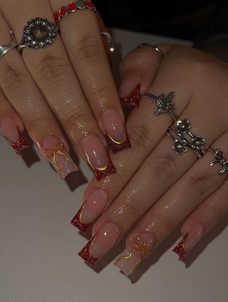 Shimmering red glitter French tips with 3D gold bows and elegant gold outlines combine sparkle and structure.