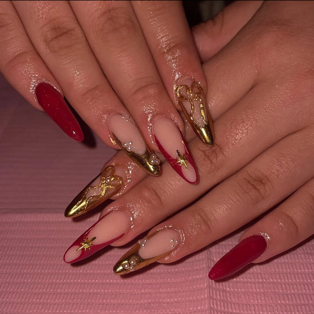 Almond-shaped nails featuring solid ruby red and nude bases paired with metallic gold tips and 3D bows look refined and celebratory.