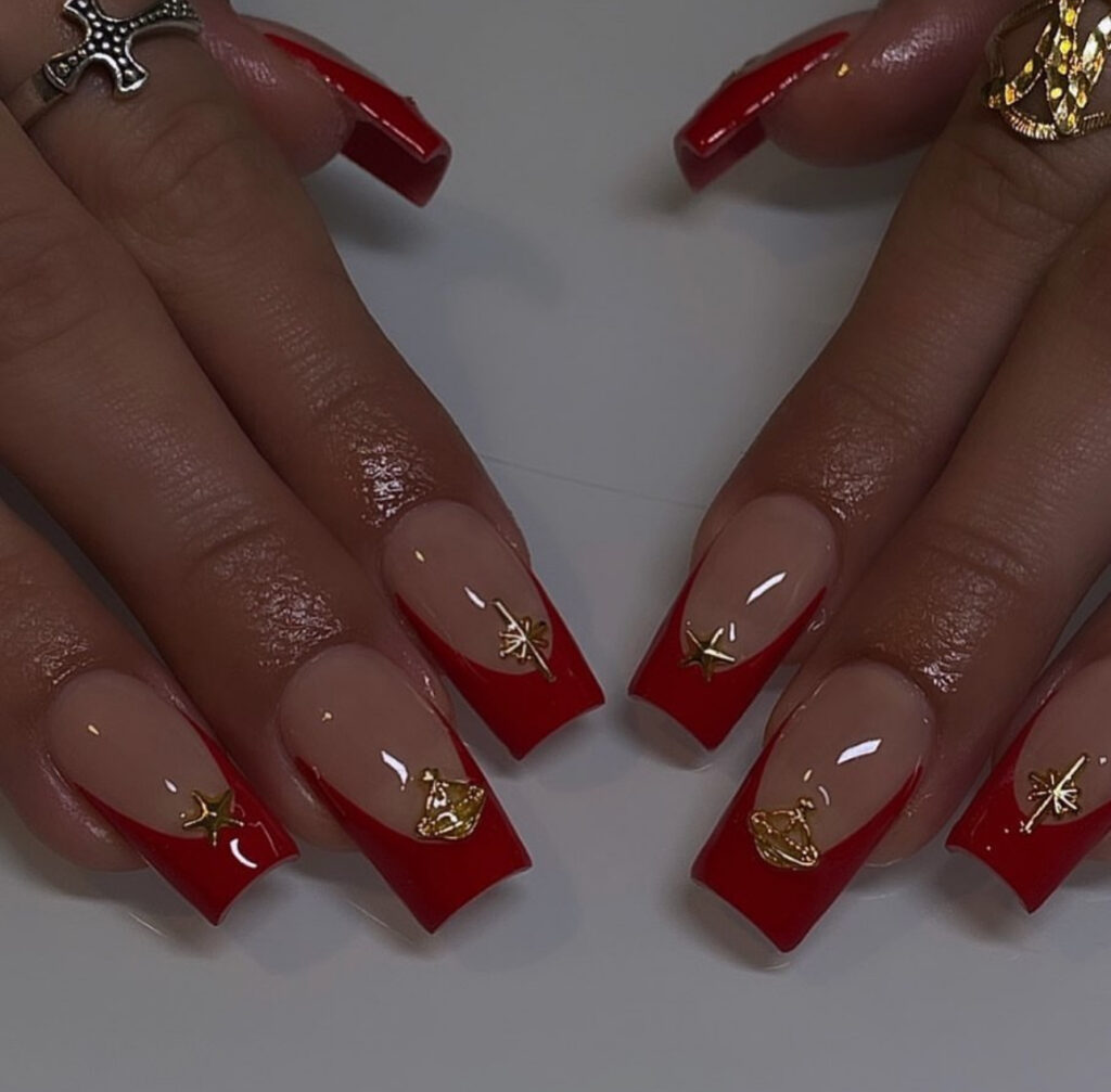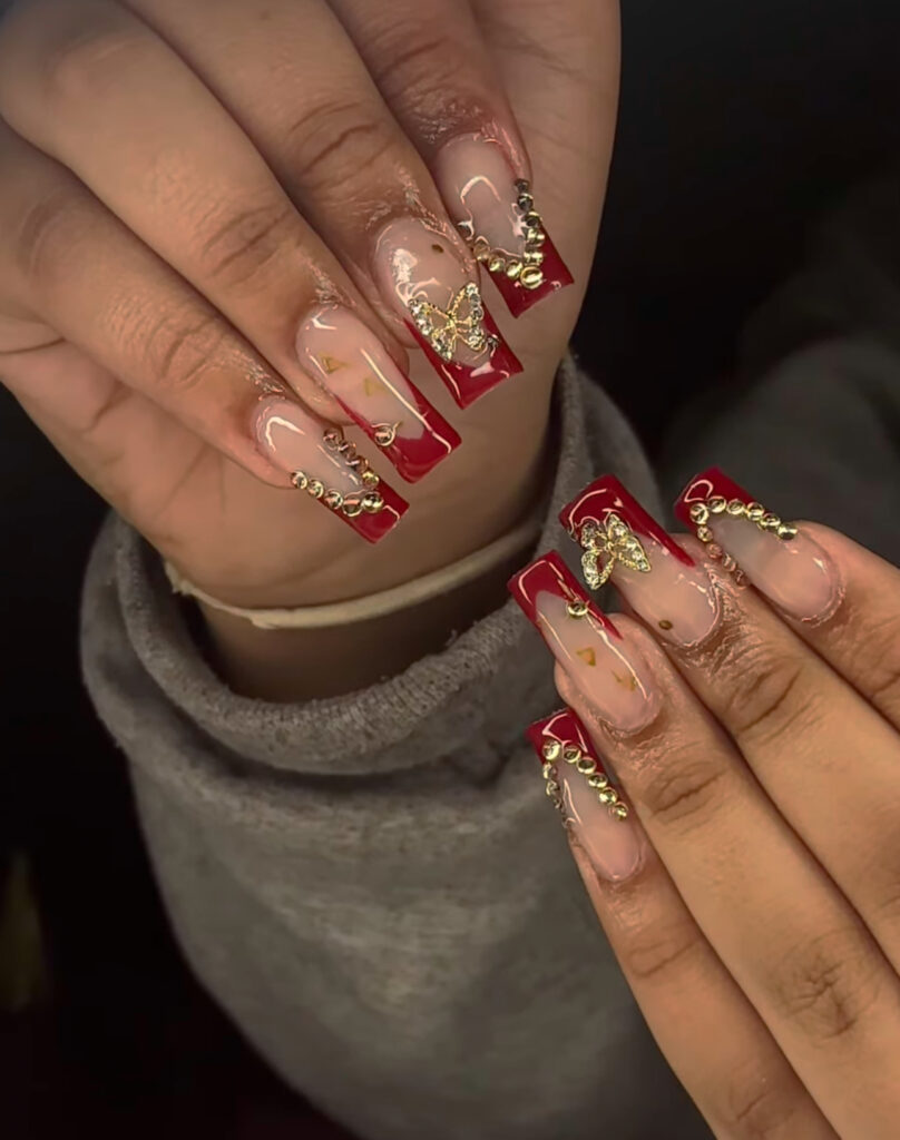 Red French tips with butterfly charms and gold star accents deserve attention again because they truly shine during holidays.