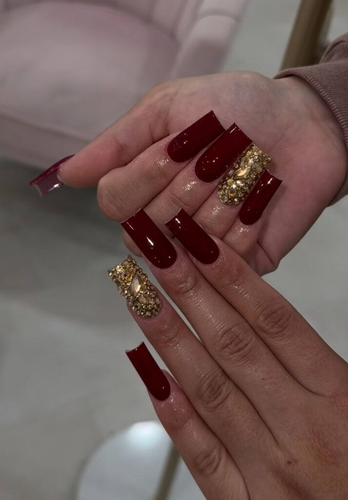 Solid deep burgundy nails look timeless. Add accent nails fully covered in shimmering gold rhinestones, and you create balance between bold and glam.