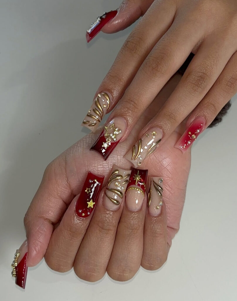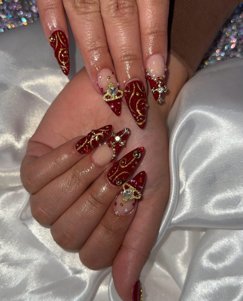 This mix of deep red and nude bases with 3D gold swirls and pearl accents screams celebration. If you love extra details, this one fits you perfectly.