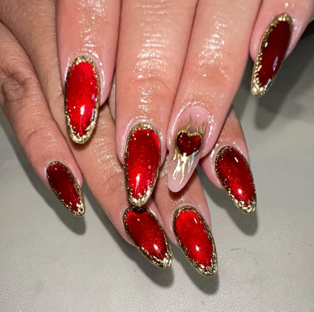 Bold almond shaped nails in shimmering ruby red already look powerful. Add textured gold borders and a flaming heart accent, and you create serious statement nails.