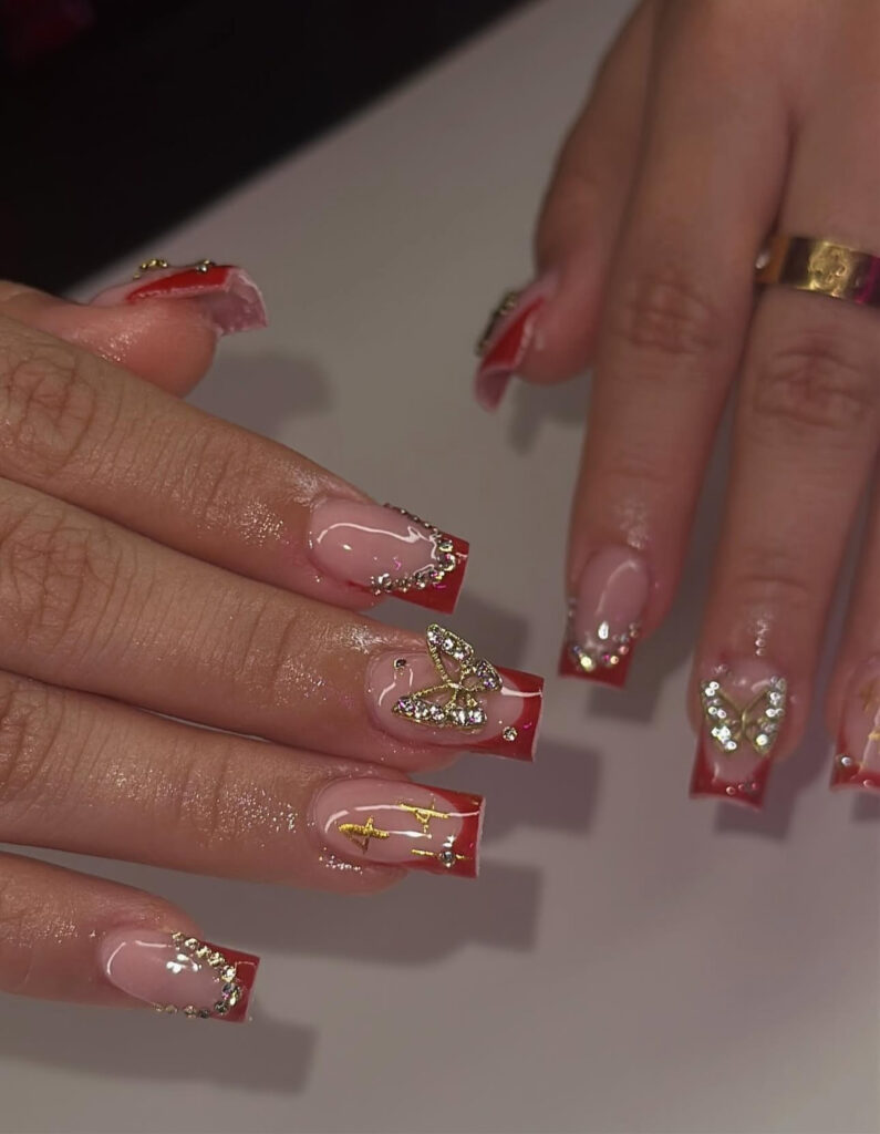 Red French tips decorated with sparkling butterfly charms and delicate gold star accents instantly feel celebratory.