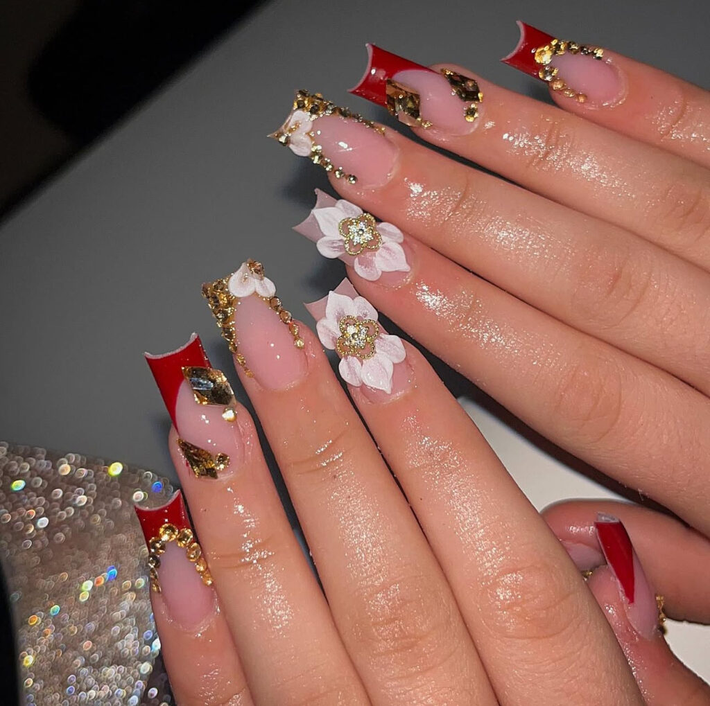 If you want something luxurious, try red French tips with 3D white flowers, gold gems, and gold leaf accents.