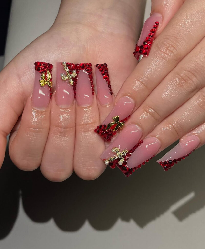 A sheer pink base framed with vibrant red rhinestones already looks glamorous. Add 3D gold butterfly and bow charms, and you create pure sparkle.
