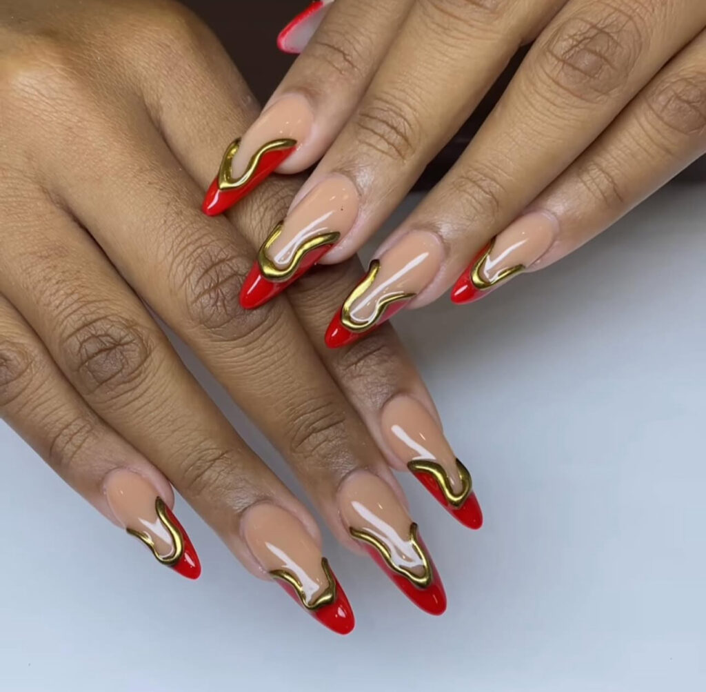 Almond-shaped nails with red tips already look chic. But once you outline the French tip with a 3D metallic gold border, the entire look transforms.
