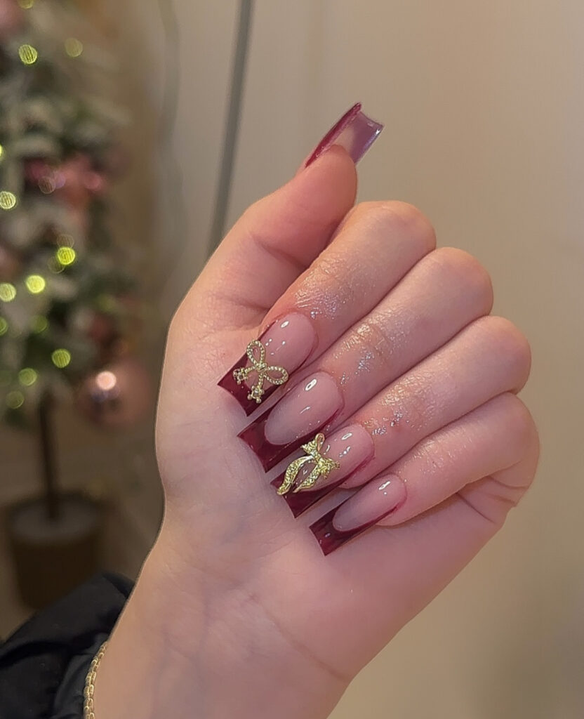 2. Try Deep Burgundy French Tips with 3D Gold Bows