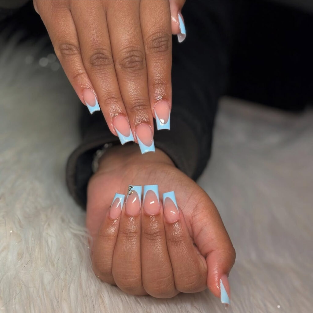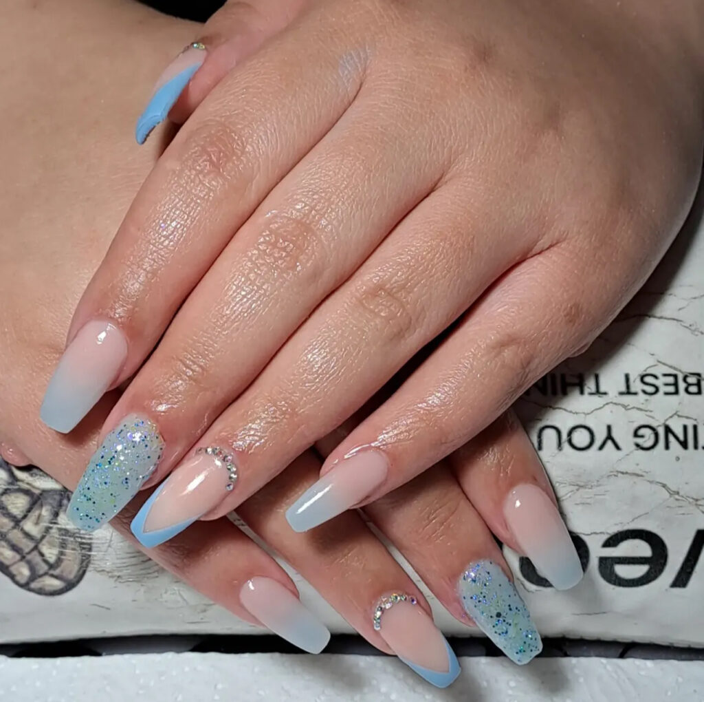 This design mixes light blue ombre, glitter accents, and V cut French tips, creating a look that feels elegant without looking overdone.