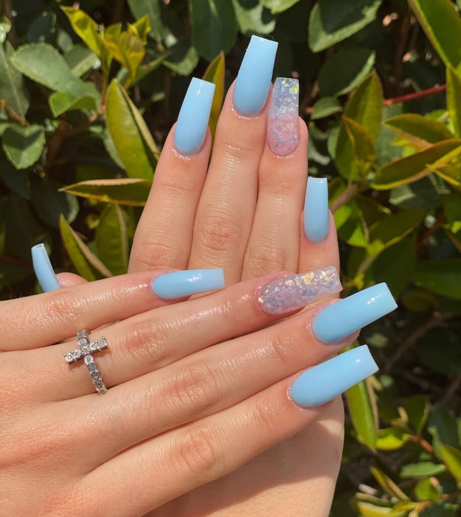 Sometimes the best design is the simplest one. Solid baby blue nails look clean, bright, and effortless.