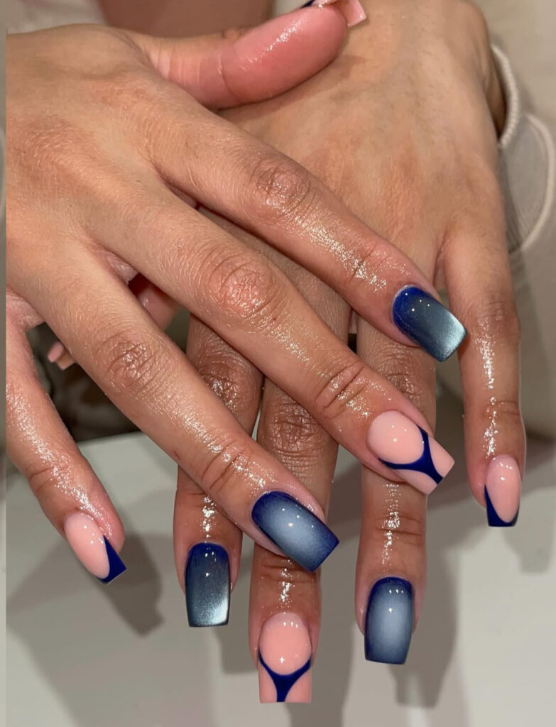 Sometimes the simplest designs look the most polished. Glossy navy blue French tips on a nude base create a classic and refined style.